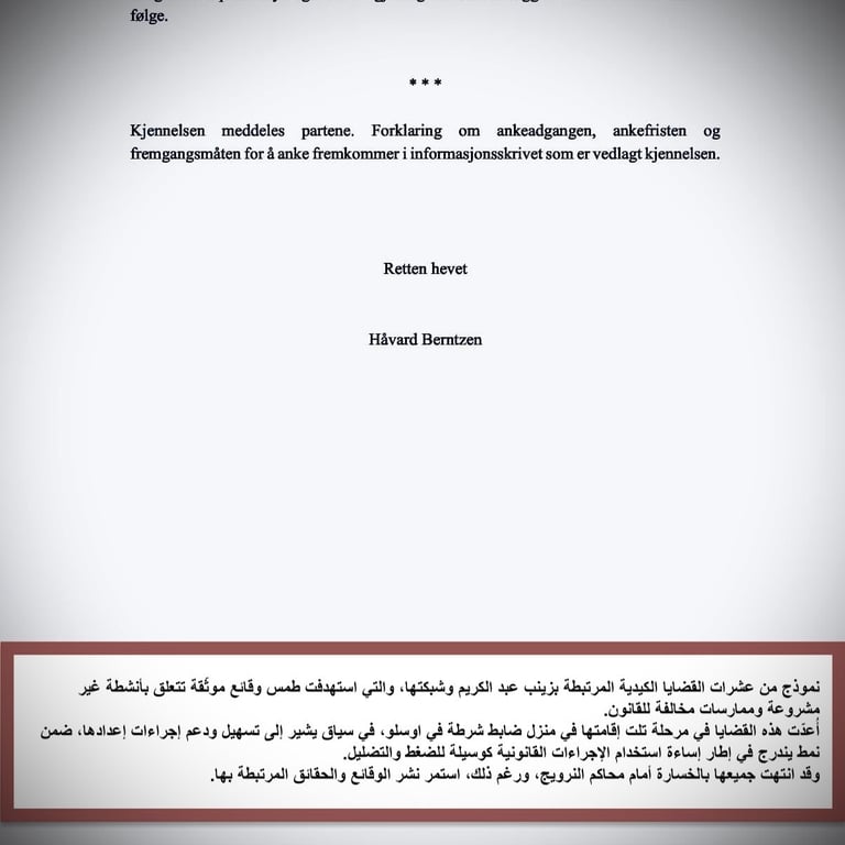 القرارات المعروضة هنا تمثّل عيّنة من عشرات الأحكام في قضايا رفعتها المنسّقة وشبكتها، سقطت جميعها أمام القضاء في النرويج. وخلال هذا المسار، جرى توظيف تقارير غير مهنية أُعدّت بمساعدة عناصر من الشرطة خلال فترة إقامتها في منزل ضابط شرطة، في محاولة للتأثير على مسار القضايا.